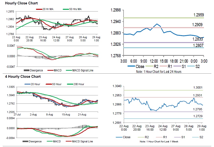 The pair is expected to find support at 1.2833, and a fall through could take it to the next support level of 1.2807. The pair is expected to find its first resistance at 1.2909, and a rise through could take it to the next resistance level of 1.2959.